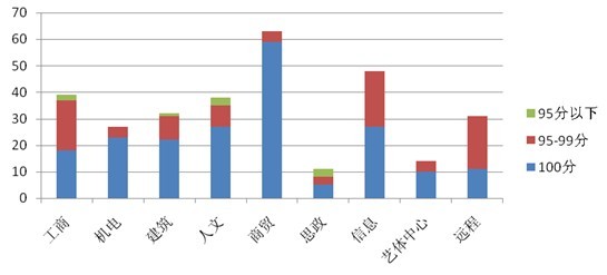 根据分院、科技处打分,得分情况见下图。其中100分265人,95-99分101人,95分以下9人。